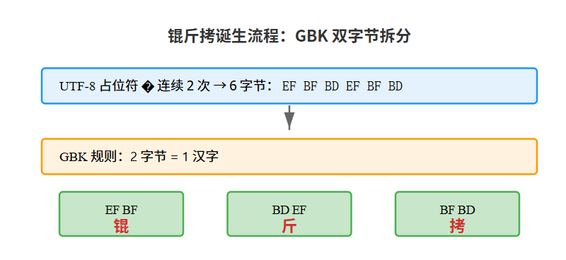 GBK 的解读 :GBK 是一种早期的中文编码标准,它用两个字节来表示一个汉字。当 UTF-8 中的替换字符 �(其 UTF-8 字节序列为 0xEF 0xBF 0xBD)被 GBK 编码系统读取时,GBK 会将这三个字节两两组合,分别对应“锟”“斤”“拷”三个汉字。