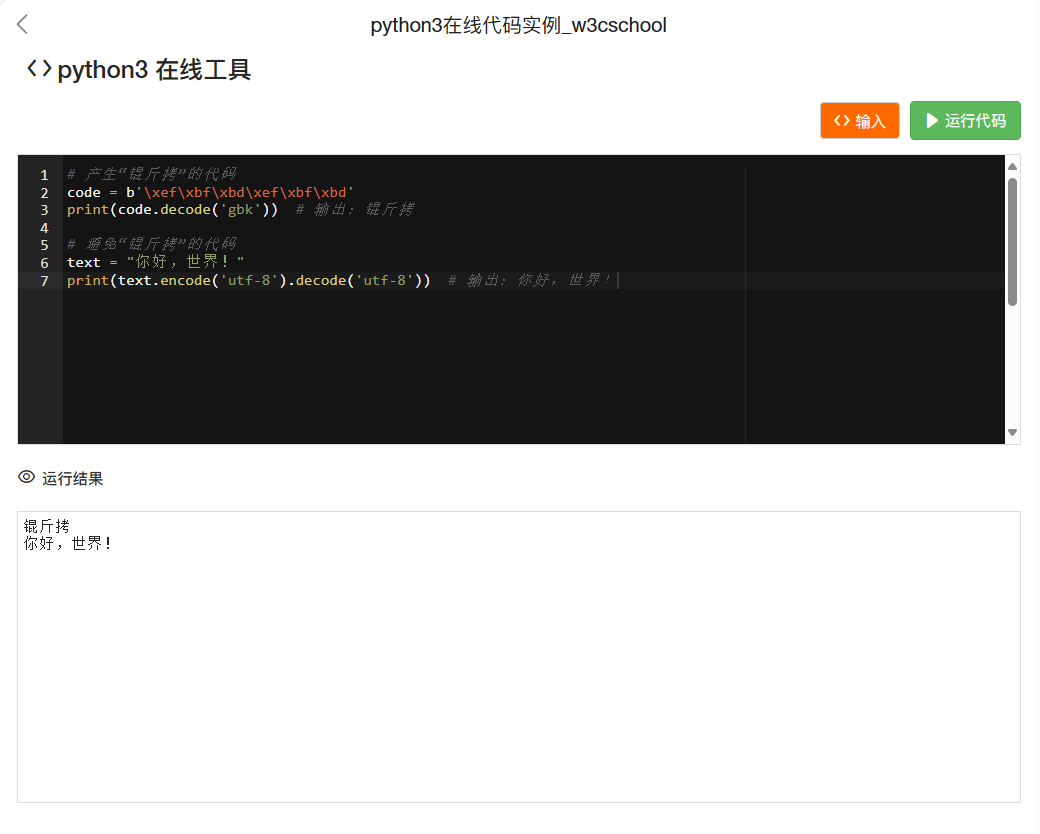 以下是使用 Python 和 Java 编程语言在编程狮(w3cschool.cn)平台上编写的代码示例,展示了如何产生“锟斤拷”以及如何避免它: