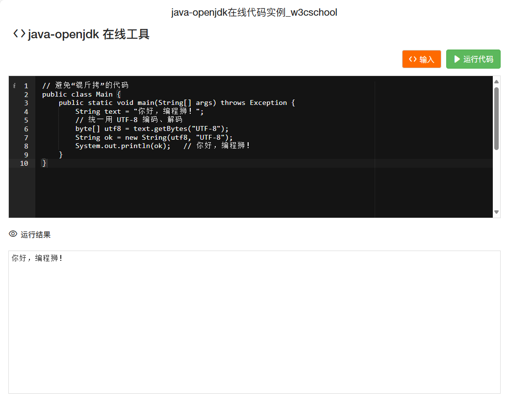 - 统一编码格式 :在开发过程中,尽量统一使用一种编码格式,如 UTF-8。在编程狮(w3cschool.cn)的在线代码编辑器中,你可以放心地使用 UTF-8 编码来编写和运行代码,避免因编码不一致导致的乱码问题。